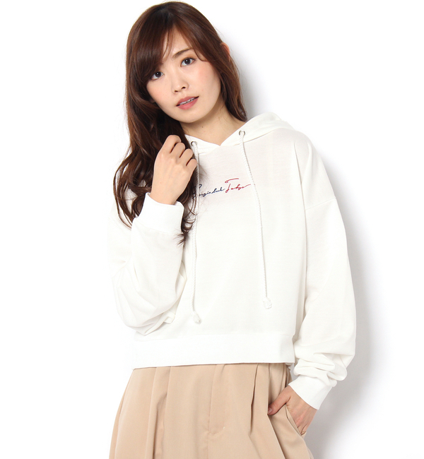 【送料無料】 ドロップショルダーがゆったりとした印象を与えるフードパーカ。トレンドのプルオーバーデザインも魅力です。フロントのロゴ刺繍が、アクセントに。短めの丈感なのでパンツにもスカートにも合わせやすく、着回しがきくアイテムに仕上げました。フードに通されたコードが長くなっていて、縦のラインをさりげなく強調します。model:H 166 cm B 83 W 58 H 85 着用サイズ:FREE フーズフーギャラリー/WHO’S WHO gallery トップス|パーカー